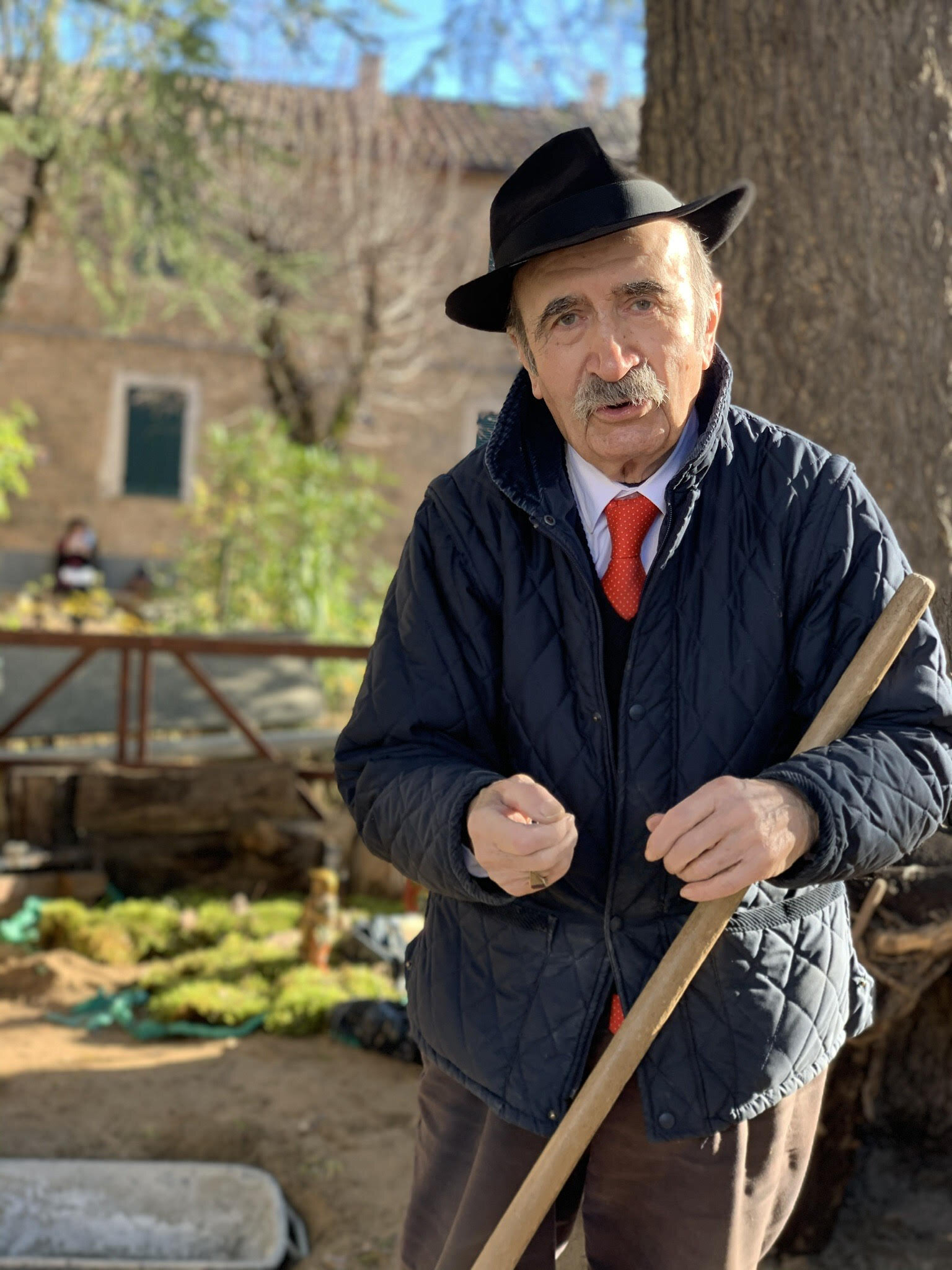 He is a dapper man with a moustache who wears a panama and braces in summer and a tie in winter. He keeps the gardens in order and at Christmas sets up an enormous nativity scene, which spreads across the gardens. This year will be the 22nd year he has set up the presepe. As is common in Italy the scene isn’t restricted to the manger, the main players and the three kings. There are water-carriers and fishermen, bridges and wells, a desert scene with camels (that La Titina often finds re-arranged in suggestive poses during the night) and a whole village with villagers going about their tasks. Each year there are additions and changes; an ambitious palm-tree oasis or home-made ladders for all the miniature olive trees.